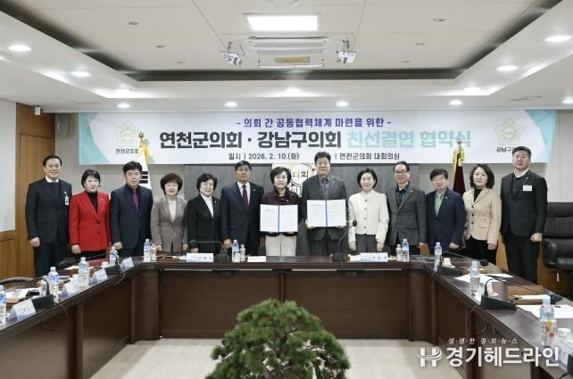 [경기헤드라인=김윤종 기자] 연천군의회와 서울시 강남구의회는 2026년 2월 10일 연천군의회 대회의실에서 친선결연식을 개최하고, 양 의회 간 우호 증진과 상호 협력을 위한 친선결연 협약식을 체결했다.