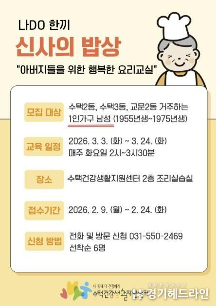 ‘나DO한끼 신사의 밥상’ 프로그램은 1955년생부터 1975년생 사이의 수택2동·수택3동·교문2동 거주 1인 가구 남성을 대상으로, ‘집밥’을 주제로 한 균형 잡힌 영양 관리 교육을 진행한다. 3월 3일부터 3월 24일까지 매주 화요일 오후 2시부터 3시 30분까지 운영될 예정이다.