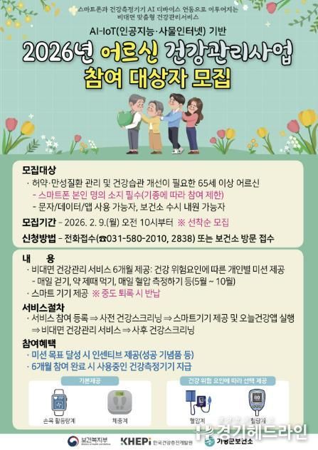 [경기헤드라인=문수철 기자] 가평군보건소가 개인 스마트폰을 활용하는 비대면 건강관리 프로그램인 ‘AI(인공지능)·IoT(사물인터넷) 기반 어르신 건강관리사업’을 올해 신규로 추진한다.