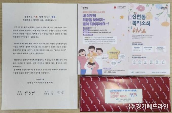 [경기헤드라인=정현수 기자] 광주시 신현동 지역사회보장협의체는 2025년 한 해 동안 신현동 내 어려운 이웃을 위해 성금과 물품을 기부한 후원자 183명에게 감사 서한을 발송했다고 12일 밝혔다.