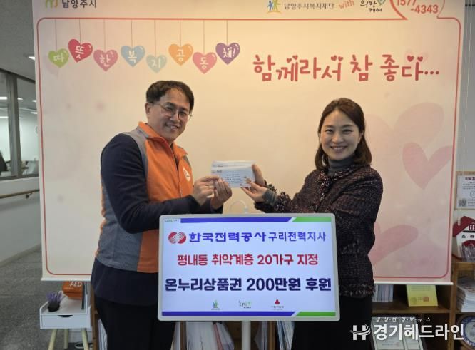 [경기헤드라인=문수철 기자] 남양주시는 지난 9일 한국전력공사 구리전력지사가 설 명절을 맞아 평내동 취약계층 지원을 위해 온누리상품권 200만 원을 동부희망케어에 전달했다고 밝혔다.