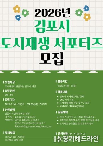 [경기헤드라인=문수철 기자] 김포시는 다양한 도시재생사업을 홍보하고 도시재생에 대한 시민들의 이해와 관심을 도모하고자 오는 12일부터 ‘2026년 김포시 도시재생 서포터즈’를 모집한다.