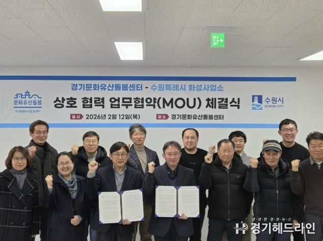 [경기헤드라인=문수철 기자] 수원시 화성사업소와 경기문화유산돌봄센터가 12일 경기문화유산돌봄센터에서 ‘수원화성 마을장인’ 육성과 수원화성 보수 네트워크 구축을 위한 업무협약을 연장 체결했다.