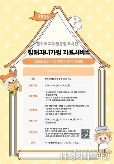 [경기헤드라인=문수철 기자] 경기도교육청중앙도서관(관장 이승호)이 장애자녀가정을 대상으로 새롭게 마련한‘장애자녀가정 자료서비스’를 운영한다.