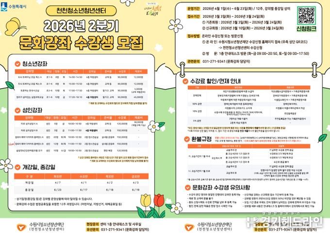 [경기헤드라인=문수철 기자] 수원시청소년청년재단 천천청소년청년센터는 지역 청소년 및 성인을 대상으로 하는 2분기 문화강좌 수강생을 모집한다고 밝혔다.