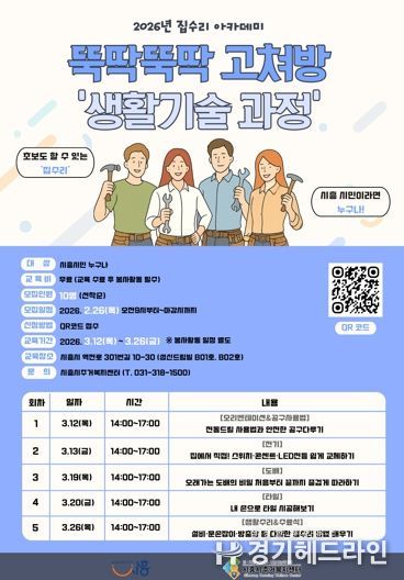 [경기헤드라인=문수철 기자] 시흥시주거복지센터는 시민이 직접 집 관리와 수리 방법을 익혀 스스로 주거 환경을 개선할 수 있도록 2026년 집수리 아카데미 ‘뚝딱뚝딱 고쳐방’ 생활기술 과정 교육생을 10명 모집한다.