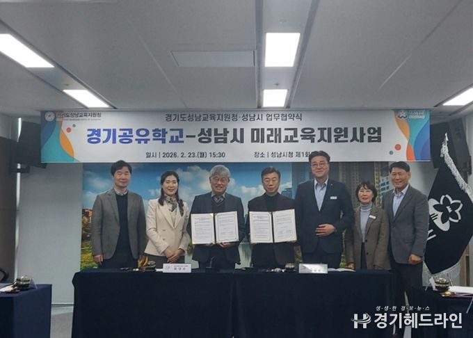 [경기헤드라인=문수철 기자] 경기도성남교육지원청은 2월 23일 성남시와 함께 지역 중심의 미래교육 생태계 조성을 위한 ‘지역교육협력을 위한 경기공유학교-성남시 미래교육지원사업 업무협약’을 체결하고, 2026년도 세부 사업 추진을 위한 부속합의를 완료했다고 밝혔다.