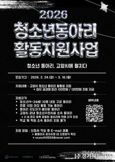 [경기헤드라인=김홍량 기자] 고양시청소년재단 성사청소년문화의집이 ‘2026년 고양시 청소년동아리 활동지원사업’에 참여할 동아리를 오는 3월 16일까지 모집한다.