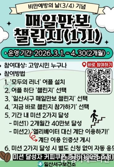 [경기헤드라인=김홍량 기자] 고양특례시 일산서구보건소는 3월 4일 ‘비만예방의 날’을 기념해 지역주민의 건강생활 실천을 유도하고 비만 예방 분위기 확산을 위해 ‘매일만보 챌린지’를 3월 1일부터 4월 30일까지 2개월간 운영한다.