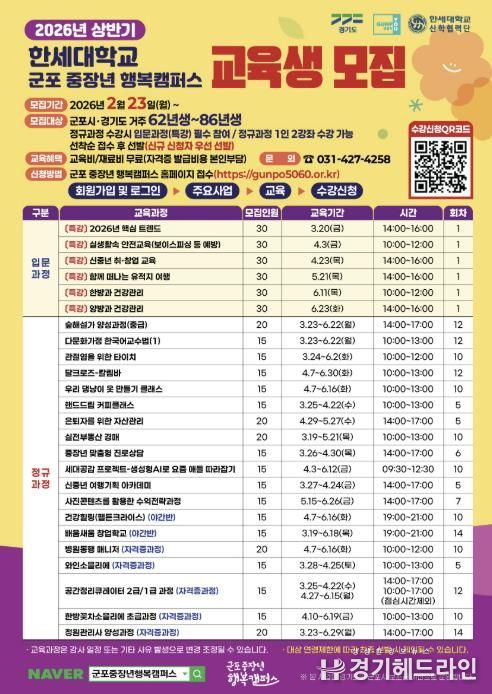[경기헤드라인=문수철 기자] 군포시가 인생 2막 설계와 사회참여 확대의 기회를 제공하고자 중장년 세대를 대상으로 2026년 상반기 중장년 행복캠퍼스 교육생을 모집한다고 밝혔다.