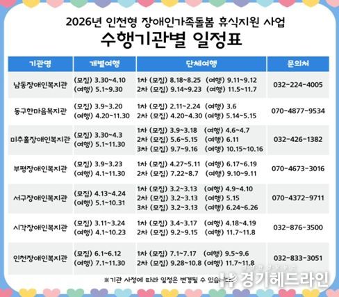 ‘장애인가족돌봄 휴식지원’ 사업은 ▲남동장애인종합복지관▲동구한마음종합복지관▲미추홀장애인종합복지관▲부평장애인종합복지관▲서구장애인종합복지관▲인천시각장애인복지관▲인천장애인종합복지관 7개 기관에서 수행한다.