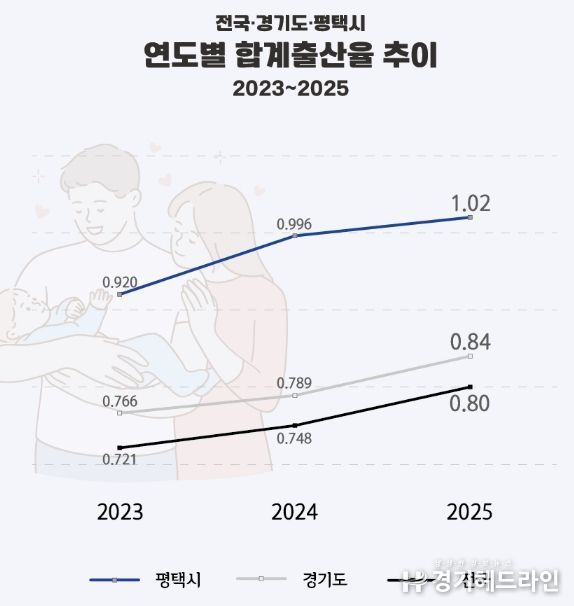 국가데이터처가 발표한 2025년 잠정 합계출산율에 따르면 평택시는 2024년 0.996에서 2025년 1.02로 상승하며 다시 1.0명을 넘어섰다. 2023년(0.92) 이후 2년 연속 상승이다.