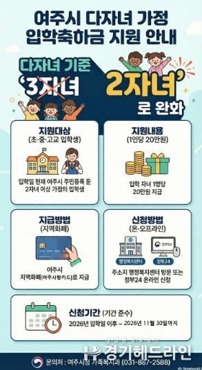 [경기헤드라인=정현수 기자] 여주시는 저출산 극복과 양육 부담 경감을 위해 다자녀 가정 기준을 3자녀 이상에서 2자녀 이상으로 확대하고 오는 3월부터 다자녀 가정 입학축하금 지원 신청을 받는다고 밝혔다.
