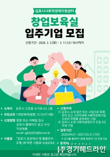 [경기헤드라인=문수철 기자] 김포시는 사회적 가치를 실현하는 초기 사회적경제기업의 안정적인 운영 및 성장을 지원하기 위해 오는 3월 3일부터 11일까지 사회적경제지원센터 창업보육실 입주기업을 모집한다.