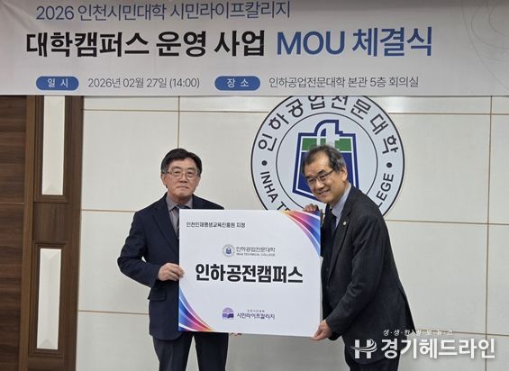 [경기헤드라인=문수철 기자] (재)인천인재평생교육진흥원은 2월 27일, 인하공업전문대학과 인천 지역의 인재 육성 및 평생교육 발전을 위한 업무협약(MOU)을 체결했다고 밝혔다.