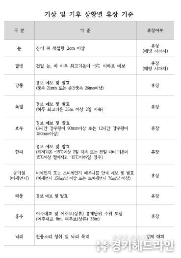 이번 휴장 매뉴얼은 적설·결빙·강풍·폭염·한파·미세먼지·태풍·낙뢰 등 다양한 기상 상황에 대해 휴장 기준과 대응 절차를 구체화한 것으로, 현장 판단에 따른 혼선을 줄이고 일관된 운영 기준을 적용하는 데 목적이 있다.