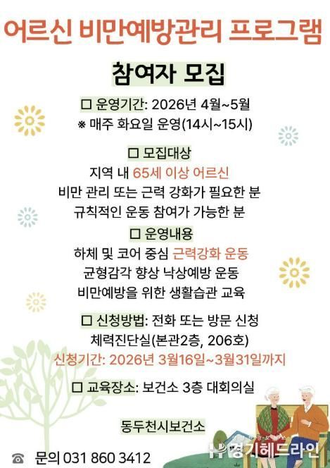[경기헤드라인=김윤종 기자] 동두천시 보건소는 오는 4월부터 어르신의 비만 예방과 근력 강화를 통한 낙상사고 예방을 위해 ‘어르신 비만예방관리 사업’을 추진한다.