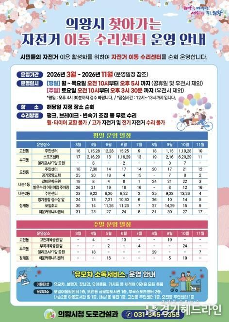 [경기헤드라인=문수철 기자] 의왕시가 시민들의 자전거 이용 활성화와 안전한 자전거 문화 확산을 위해 '2026년 찾아가는 자전거 이동 수리센터'를 운영한다.