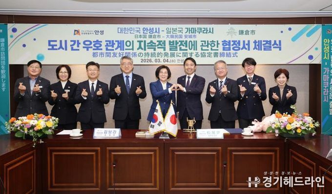 [경기헤드라인=문수철 기자] 안성시는 2026년 3월 4일 오전 11시 안성시청 본관 2층 상황실에서 일본 가나가와현 가마쿠라시(시장 마쓰오 다카시)와 '도시 간 우호 관계의 지속적 발전에 대한 협정'을 체결하고 양 도시 간 문화·예술 및 청소년 분야 교류를 본격 추진하기로 했다.