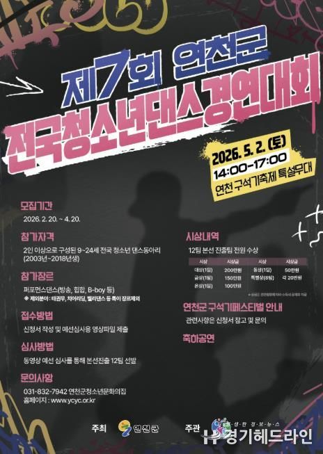 [경기헤드라인=김윤종 기자] (재)연천군청소년육성재단(청소년문화의집)은 전국 청소년들이 꿈과 열정을 마음껏 펼칠 수 있는 무대를 마련하고, 창의적인 문화예술 활동을 확산하기 위해 제7회 연천군 전국청소년댄스경연대회를 개최한다고 밝혔다.