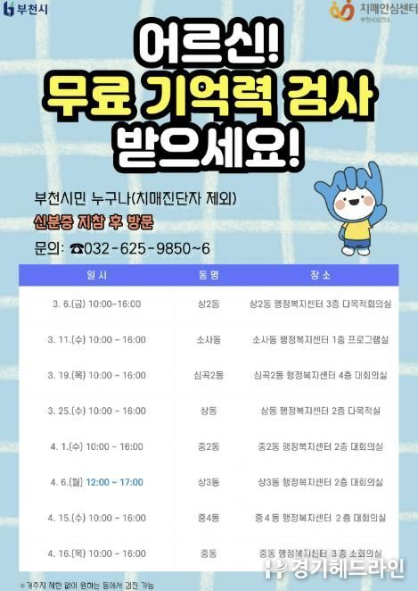 [경기헤드라인=문수철 기자] 부천시는 치매 조기 발견과 중증화 예방을 위해 3월 6일부터 4월 16일까지 ‘2026년 상반기 찾아가는 치매조기검진(동별검진)’을 실시한다.