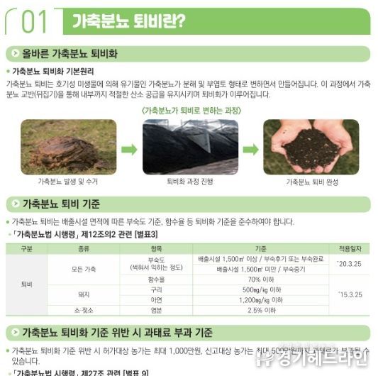 관내 축산농가 중 허가대상은 연 2회, 신고대상은 연 1회 검사 의무화 '가축분뇨의 관리 및 이용에 관한 법률'에 따라 가축분뇨 배출시설 설치 및 운영자, 퇴·액비를 처리·살포하는 자는 반드시 부숙도 검사를 실시해야 한다. 특히, 퇴·액비를 외부로 반출할 때는 반드시 부숙도 검사를 완료하고 '부숙완료' 판정을 받은 퇴비만을 반출해야 법적 불이익을 피할 수 있으며, 검사를 희망하는 농가는 퇴비 더미 중 5~10군데에서 2㎏ 이상 채취해 균일하게 혼합 후 500g 가량을 정해진 시료 봉투에 담아 여주시 농업기술센터 내 종합검정실 2층에 방문·의뢰하면 무료로 검사결과를 받을 수 있다.