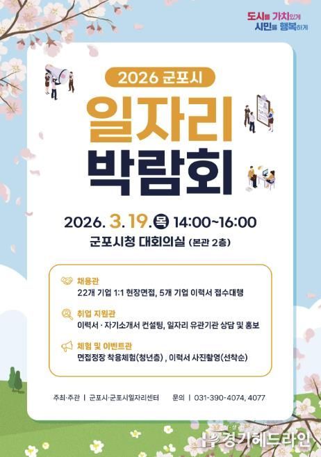 [경기헤드라인=문수철 기자] 군포시는 오는 3월 19일 오후 2시부터 시청 대회의실에서 ‘2026년 군포시 일자리 박람회’를 개최한다. 이번 박람회는 지역 내 우수 기업과 구직자가 직접 만나는 채용의 장으로 제조, 서비스, 물류배송, 의료복지 등 다양한 분야에서 폭넓은 취업 기회를 제공할 예정이다.