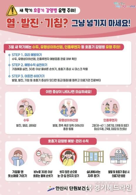 [경기헤드라인=문수철 기자] 안산시 단원보건소는 새 학기를 맞아 유치원과 초·중·고등학교를 중심으로 호흡기 감염병 발생 증가가 우려됨에 따라 학생과 교직원의 각별한 주의를 당부했다.