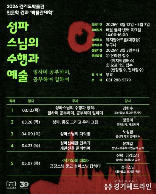 [경기헤드라인=문수철 기자] 경기도박물관은 오는 3월 12일부터 ‘2026 경기도박물관 박물관대학(인문학 강좌)’을 운영한다. 경기도박물관 박물관대학(인문학 강좌)은 매년 역사·문화와 관련한 시의성 있는 주제를 선정해 도민에게 제공하는 교육프로그램이다.