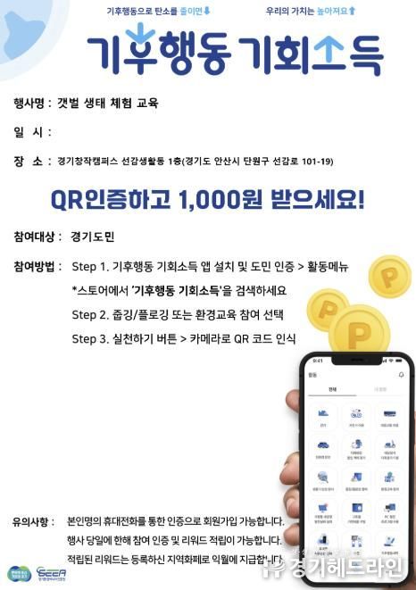 '기후행동 기회소득'은 경기도가 도민과 함께 탄소중립 실천을 위해 경기환경에너지진흥원 주관으로 추진하는 참여형 정책 사업으로 도민들이 전용 어플리케이션을 통해 기후행동 실천 활동을 인증할 경우 연간 최대 1만원 범위 내에서 지역화폐 리워드를 지급받을 수 있도록 구성되어 있다. 경기창작캠퍼스는 경기 서해 바다의 생태 환경을 바탕으로 조성된 체험형 교육 공간인 ‘갯벌놀이터’ 체험 활동을 '기후행동 기회소득' 사업 중 기후행동 실천 활동 환경교육으로 승인받아 운영하게 된다.