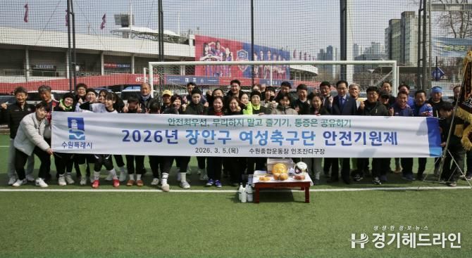 [경기헤드라인=문수철 기자] 수원시 장안구 여성축구단은 지난 5일, 수원종합운동장 인조잔디구장에서 선수단과 관계자 등 30여 명이 참석한 가운데 2026년 안전기원제를 진행했다.