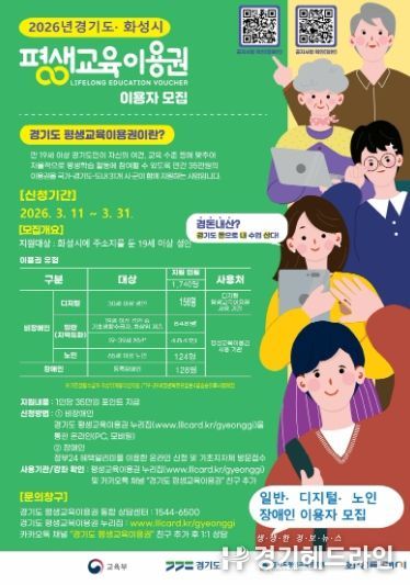 [경기헤드라인=문수철 기자] 화성특례시는 평생학습 소외계층의 학습권을 보장하고 교육격차를 완화하기 위해 ‘2026년 평생교육이용권 지원사업’ 이용자 1차 모집을 오는 3월 11일부터 31일까지 실시한다고 밝혔다.