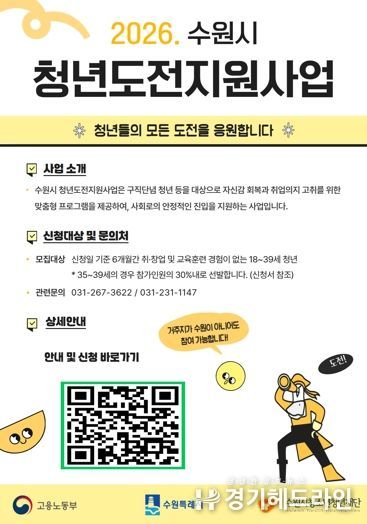 [경기헤드라인=문수철 기자] 수원시청소년청년재단 수원시청년지원센터는 취업 준비 과정에서 어려움을 겪고 있는 청년을 대상으로 ‘2026 수원시 청년도전지원사업’ 참여자 130명을 모집한다고 6일 밝혔다.