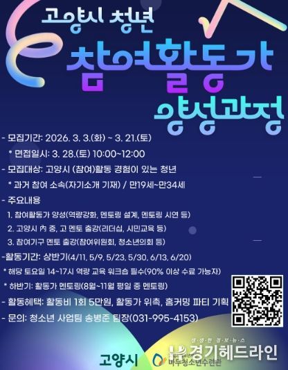 [경기헤드라인=김홍량 기자] 고양시청소년재단 마두청소년수련관은 고양시에서 다양한 참여 활동을 경험한 청년들을 전문적인 역량을 갖춘 멘토로 육성하는 ‘2026 고양시 청년참여활동가 양성과정’ 참가자를 모집한다.