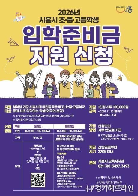 [경기헤드라인=문수철 기자] 시흥시는 지난 3월 3일부터 ‘시흥시 초중고 입학준비금 지원사업’ 신청을 받고 있다. 이번 사업은 입학 준비에 필요한 비용을 보편적으로 지원해 교육기본권을 강화하고 학부모의 경제적 부담을 완화하기 위해 올해 처음 시행되는 제도다.