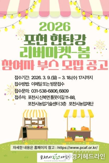 [경기헤드라인=김홍량 기자] 포천시농업재단은 오는 5월 한탄강 생태경관단지에서 열리는 ‘2026년 포천 한탄강 리버마켓-봄’ 행사에 참여할 부스 운영자를 공개 모집한다.