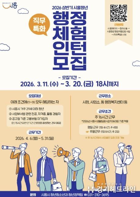 [경기헤드라인=문수철 기자] 시흥시는 지역 청년들의 실질적인 일 경험과 진로 탐색을 지원하기 위해 ‘2026년 (직무특화) 상반기 행정체험 인턴 사업’을 운영하고, 3월 11일부터 20일까지 참여 청년 10명을 모집한다.