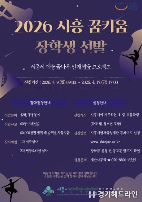 [경기헤드라인=문수철 기자] 시흥시인재양성재단은 지역 내 예능 분야 인재를 발굴ㆍ육성하기 위해 ‘2026년 시흥 꿈키움 장학생’을 60명 이내로 선발한다.
