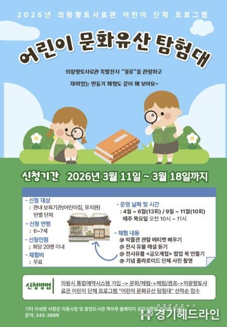 [경기헤드라인=문수철 기자] 의왕시 향토사료관이 오는 4월부터 6월, 9월부터 10월 매주 목요일에 어린이 단체 체험프로그램 ‘어린이 문화유산 탐험대’를 운영한다.