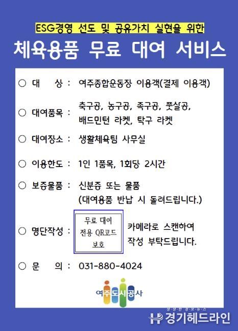 [경기헤드라인=정현수 기자] 여주도시공사는 여주종합운동장 이용 시민들의 편의를 높이기 위해, 2023년부터 시행해 온 ‘체육용품 무료대여 서비스’를 오는 2026년 4월 1일부터 대폭 확대 운영한다.