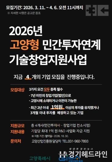 [경기헤드라인=김홍량 기자] 고양산업진흥원이 유망 기술창업기업의 투자 유치와 기술 고도화를 지원하기 위한 ‘2026년 고양형 민간투자연계 기술창업지원사업’에 참여할 창업기업을 모집한다.