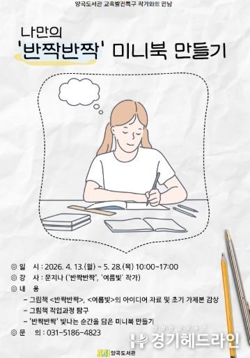 [경기헤드라인=문수철 기자] 김포시 양곡도서관은 2026년 교육발전특구 사업의 일환으로 4월 13일부터 5월 28일까지 관내 초등학생을 위한 스트레스 관리 프로그램 '나만의 ‘반짝반짝’ 미니북 만들기'를 운영한다.