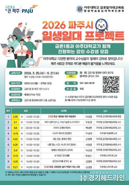 ‘일생일대 프로젝트’는 대학과 읍면동이 연계해 시민에게 양질의 평생학습을 제공하는 파주형 생활권 평생학습 모델이다. 금촌1동은 올해 처음으로 이번 사업에 참여했으며, 대학의 우수한 교수진이 직접 강의해 시민들이 일상 가까이에서 수준 높은 배움을 누릴 수 있도록 마련됐다.
