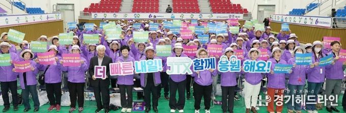 [경기헤드라인=정현수 기자] 광주시는 13일 제72회 경기도체육대회 및 경기도장애인체육대회 자원봉사자 발대식에서 중부권 광역급행철도(JTX) 조기 착공을 응원하는 시민 퍼포먼스를 진행했다.