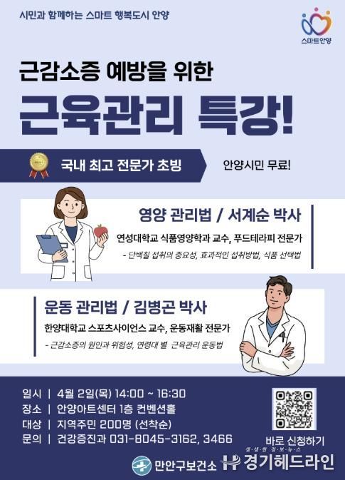 [경기헤드라인=문수철 기자] 안양시 만안구보건소는 오는 4월 2일 오후 14시부터 안양아트센터 컨벤션홀(1층)에서 ‘지역주민 근감소증 예방을 위한 영양·운동관리 건강강좌’를 개최한다고 16일 밝혔다.