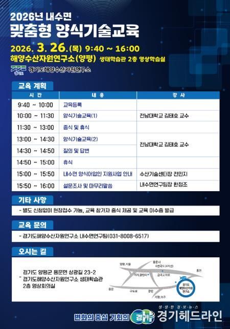 [경기헤드라인=문수철 기자] 경기도해양자원연구소는 오는 26일 양평에 있는 연구소 생태학습관에서 내수면 양식 어업인의 역량 강화를 위한 양식기술교육을 실시한다.