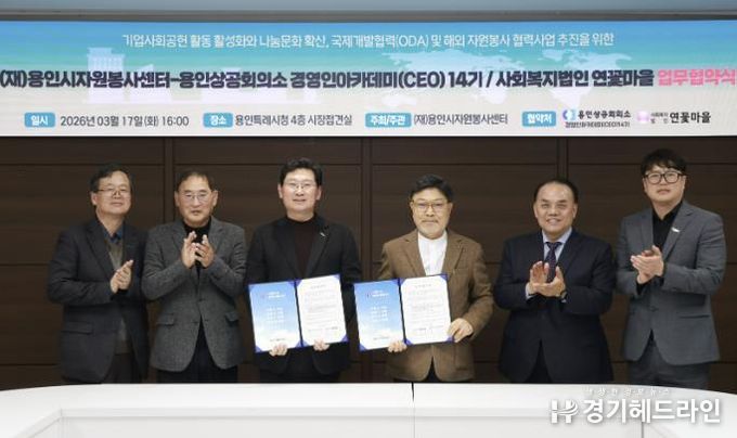 협약식에는 용인시자원봉사센터 이사장인 이상일 시장을 비롯해 구성회 용인상공회의소 경영인 아카데미(CEO) 14기 회장과 임원진, 조당호 사회복지법인 연꽃마을 대표이사, 김기태 처인노인복지관 관장 등이 참석했다.