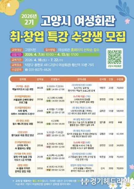 [경기헤드라인=김홍량 기자] 고양특례시 여성회관이 오는 4월 7일부터 2026년 취·창업 특강(2기) 수강생을 모집한다.