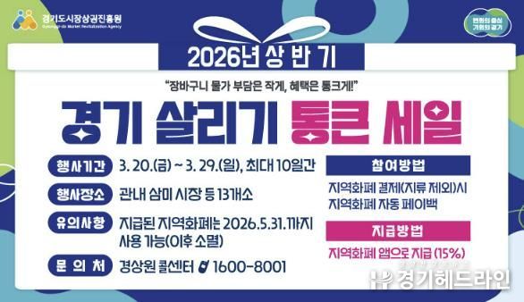 [경기헤드라인=문수철 기자] 시흥시는 고물가로 위축된 민생경제에 활력을 불어넣고 소상공인의 매출 증대를 돕기 위해 오는 3월 20일부터 29일까지 관내 전역에서 ‘2026년 상반기 경기 살리기 통큰 세일’을 개최한다.