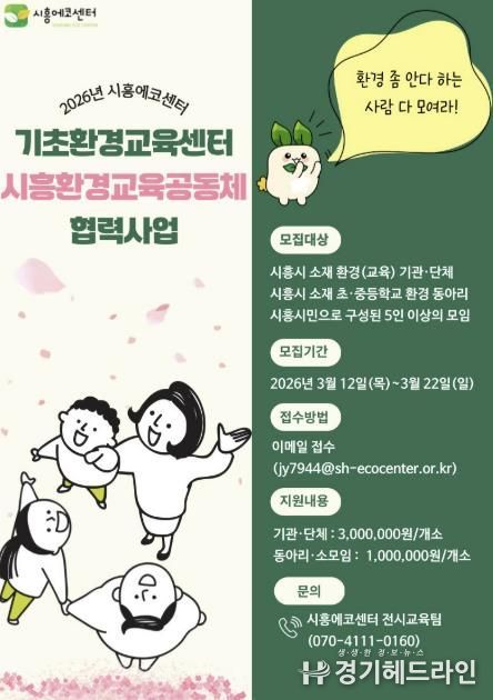 [경기헤드라인=문수철 기자] 시흥시는 지역 공동체 간 협력을 바탕으로 환경교육을 활성화하고, 환경교육 네트워크를 강화하기 위해 ‘2026년 기초환경교육센터-시흥환경교육공동체 협력사업’을 추진한다.